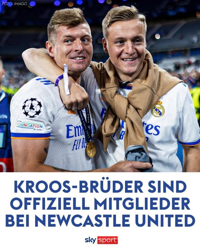德国中场巨擘托尼·克罗斯曾在8月份看完10人纽卡2比3惜败利物浦的比赛后表示,纽卡将士的表现太让他感动,他决定要成为纽卡的俱乐部会员。 说到做到,近日,克罗斯和弟弟菲利克斯在他们的播客中宣布:“我们现在正式成为纽卡的会员了!”而为了表示欢迎,这家英格兰东北俱乐部特意向他们赠送了一个装有个性化主场球衣的礼包。